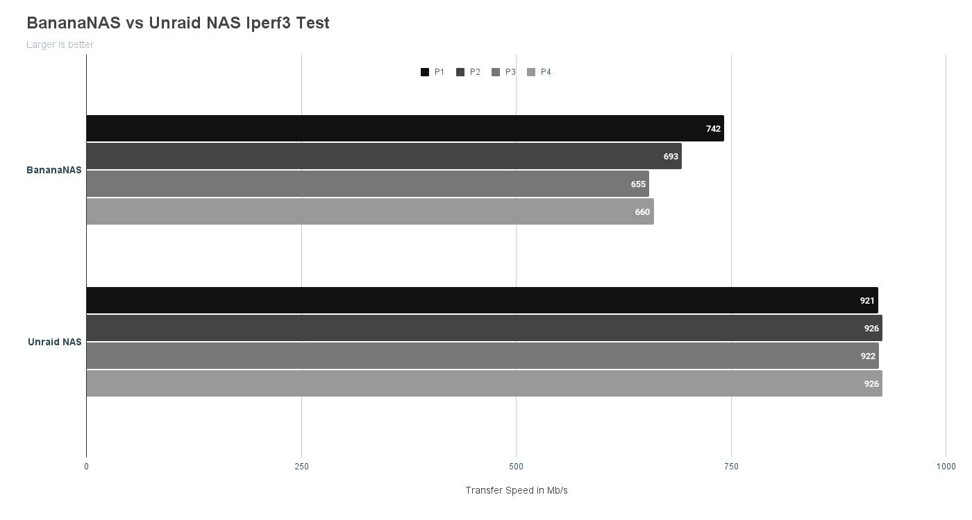 Hasilnya, kecepatan transfer BananaNAS 50% lebih lambat ketimbang Unraid NAS untuk operasi baca dan tulis. Kecepatan tulis BananaNAS untuk berkas yang berukuran kecil terlihat lebih lambat dibandingkan berkas dengan ukuran yang lebih besar. Sementara Unraid NAS terlihat lebih stabil di semua ukuran berkas yang ditransfer.